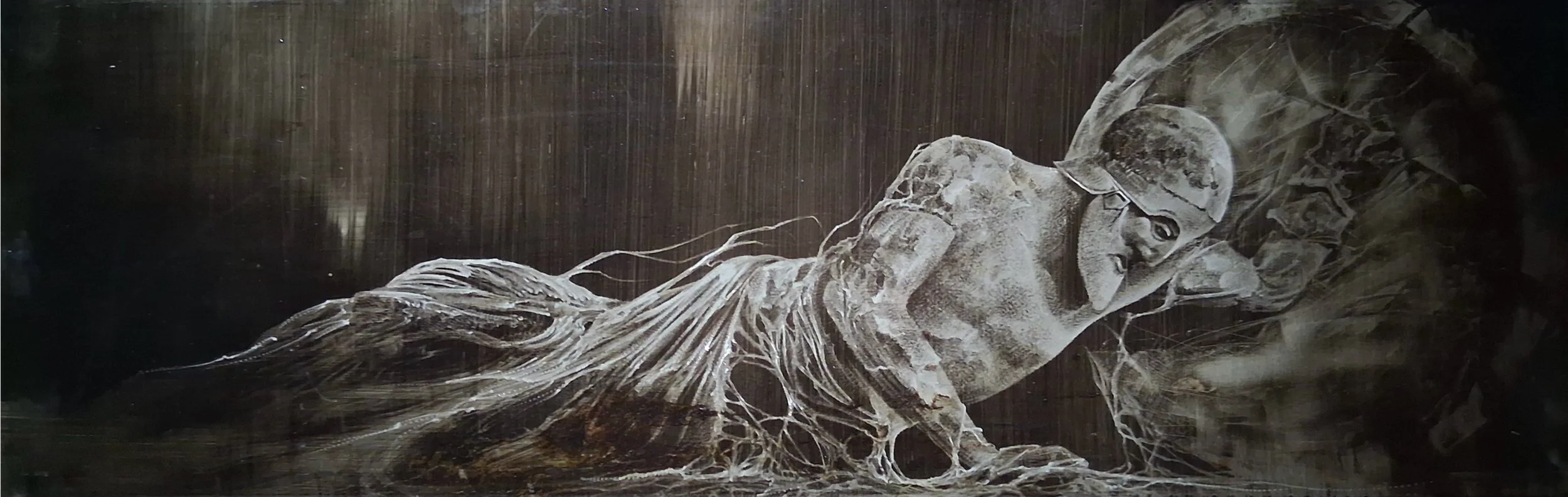 ‘Fallen Warrior’ Unframed: 83x28x5cm Tattooed Steel with Oil 2025
